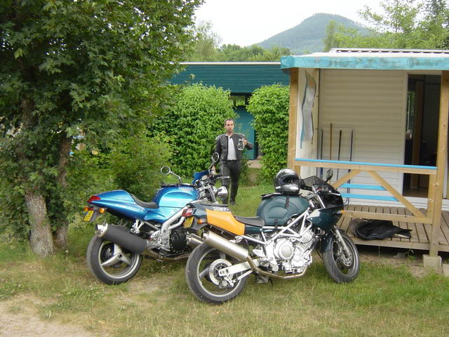 Objectif de l’après midi : le col du Fouchy. Pour s’y rendre on repasse du coté de la route des crêtes et du col de la Schulcht. Plein de monde et de groupes de motards allemands tous plus vintage les uns que les autres. On ne prend pas trop le temps de faire copain copains et on les enfume au propre comme au figuré. Pour rejoindre le Fouchyama, Jeanjean nous fait passer par une énième route à chèvres et me fait bien marrer à faire semblant de se sortir dans les épingles. Le paysage est magnifique et on est tout contents d’avoir quitté la foule des grands axes (route des crêtes le dimanche, col de la Schulcht). Ca y’est on peut grimper le Fouchy, dans ce sens c’est un peu moins sympa mais on se fait bien plaisir quand même. Parait que j’ai encore fait un dépassement un peu sport mais je trouve qu’on voit bien par-dessus un cabriolet. Après une pause dans une sorte de gite où ils nous avaient pris pour des américains (53 euros par personne la nuit…au début j’avais pas tilté mais c’est hyper cher) on se pose dans le camping « Campéole ». J’étais bien chaud pour repartir vers le mont Saint Odile (j’avais gardé mon cuir alors qu’il faisait 40) mais Féfé lambinant et Jeanjean pas hyper hyper motivé m’ont refroidis en me montrant le ciel. Là, Ed se pointe en nous disant que le camping annonce alerte de gros orages, orange ! Wouais…au nord c’est dégagé et le mont saint odile c’est au nord. Fais ierch. Tant pis, on décide de mettre les meules à l’abri sous les arbres puis carrément à coté des chiottes. Bien nous en a pris car la fin du monde s’est abattu sur nous. Un orage de grêle avec d’énormes rafales de vent et la foudre tombant sur les lignes hautes tension de la montagne d’en face pour créer des arcs électriques gigantesques ! J’avoue qu’on n’aurait pas fait les marioles si ça nous était tombé sur la gueule en rentrant du mont Saint Odile. Pour fêter notre victoire sur les éléments on va boire des bières au bar du camping puis manger des tartes flambées et descendre quelques boutanches d’un excellent pinot noir alsacien. On est bien chauds pour le lendemain car il ne pleut plus et ça aura peut être le temps de sécher pendant la nuit…